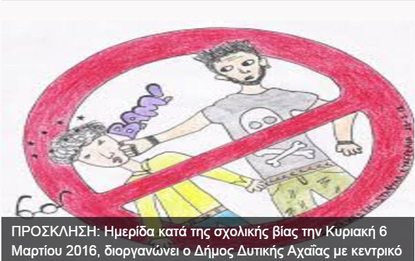 Ο Δήμος Δυτικής Αχαΐας και ο Τομέας Παιδείας προσπαθώντας να συμβάλει στη σωστή & επιστημονική ενημέρωση τόσο των μαθητών & γονέων όσο και των εκπαιδευτικών καθώς και για την ενιαία στάση που πρέπει να ακολουθήσουν για την αντιμετώπιση της βίας, διοργανώνει την Κυριακή 6 Μαρτίου 2016 και ώρα 19:00 στο πολιτιστικό κέντρο «Μελίνα Μερκούρη», στην Κάτω Αχαΐα , ημερίδα με κύριο ομιλητή τον