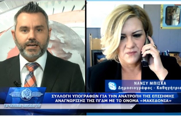 Η καθηγήτρια και δημοσιογράφος Νάνσυ Μπίσκα από τη Νέα Υόρκη, μίλησε στο Πόντος TV Κεντρικής Μακεδονίας σχετικά με την παγκόσμια κινητοποίηση της ελληνικής Ομογένειας, μέσω συλλογής υπογραφών, για να αρθεί η προσωρινή αναγνώριση των Σκοπίων ως «Μακεδονία» από τις ΗΠΑ.