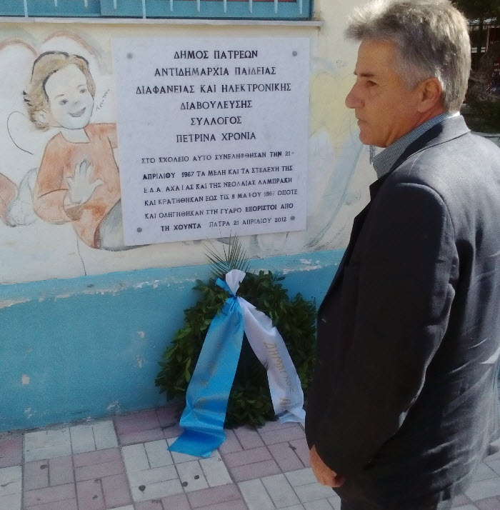 Την Πέμπτη 21 Απριλίου, με αφορμή τη μαύρη επέτειο επιβολής της χούντας στη χώρα μας, ο Δήμος Πατρέων, τιμώντας τους αγωνιστές που εξορίστηκαν, φυλακίστηκαν και βασανίστηκαν από τους δικτάτορες, πραγματοποίησε δύο εκδηλώσεις μνήμης, στο 26ο – 31ο Δημοτικό Σχολείο Αγίας Σοφίας και στο 15ο και 17ο Δημοτικό Σχολείο Δροσιάς, προς τιμήν εκείνων που το δικτατορικό καθεστώς των «Απριλιανών» συγκέντρωνε στα σχολεία αυτά για να τους προωθήσει σε τόπους εξορίας.