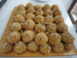 Βαζετε το βουτυρο σε λεκανη και το χτυπατε καλα να ασπρισει. Προσθετετε τη ζαχαρη, τα αμυγδαλα, τους κροκους και το μπεικιν, ανακατευοντας συνεχεια. Ριχνετε σιγα – σιγα το αλευρι και ζυμωνετε καλα να γινει αφρατη ζυμη. Πλαθετε σε διαφορα σχηματα τους κουραμπιεδες (στρογγυλους, μισοφεγγαρα, αστερια) και τους βαζετε σε βουτυρωμενη λαμαρινα η μεγαλο ταψι. Ψηνετε στους 200 βαθμους για 15 λεπτα. Βαζετε σε πιατελα, ραντιζετε με ροδονερο και πασπαλιζετε με αφθονη ζαχαρη.