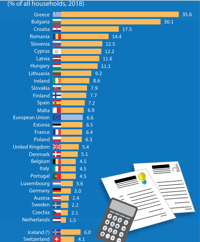 Σύμφωνα με στοιχεία της Eurostat, (βλπ. πίνακα) το συγκεκριμένο ποσοστό είναι το υψηλότερο στην ΕΕ. Συγκεκριμένα το ποσοστό των ευρωπαϊκών νοικοκυριών που δήλωσαν αδυναμία στην έγκαιρη εξόφληση των συγκεκριμένων λογαριασμών ήταν το 2018 στο 6,6% από 10% που ήταν το 2013.