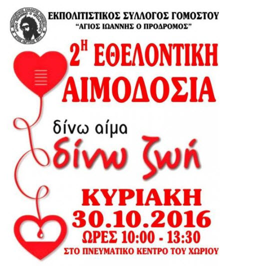 Ο Εκπολιτιστικός Σύλλογος Γομοστού σας καλεί να συμμετάσχετε στην 2η Εθελοντική Αιμοδοσία