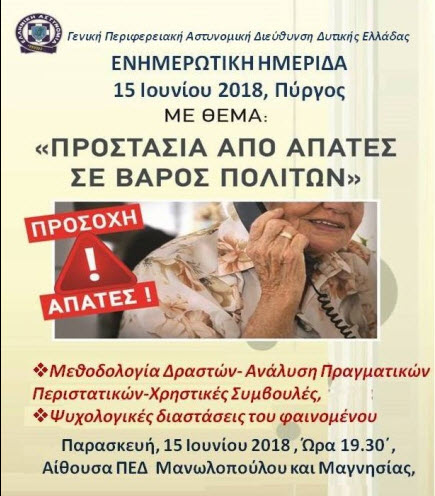 Πραγματοποίηση ενημερωτικής ημερίδας στον Πύργο, με θέμα: « Προστασία από απάτες σε βάρος πολιτών » Η εκδήλωση διοργανώνεται από τη Γενική Περιφερειακή Αστυνομική Διεύθυνση Δυτικής [more…]